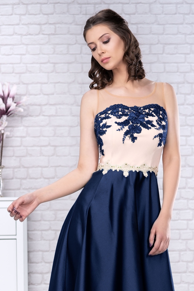 Rochia bordo are dantela aurie din talie ca rochia bleumarin.