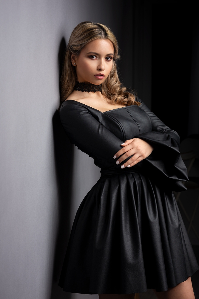 Rochie elegantă, realizată din piele ecologică de calitate, cu un design modern, ideală pentru evenimente, ținute statement sau apariții de seară.