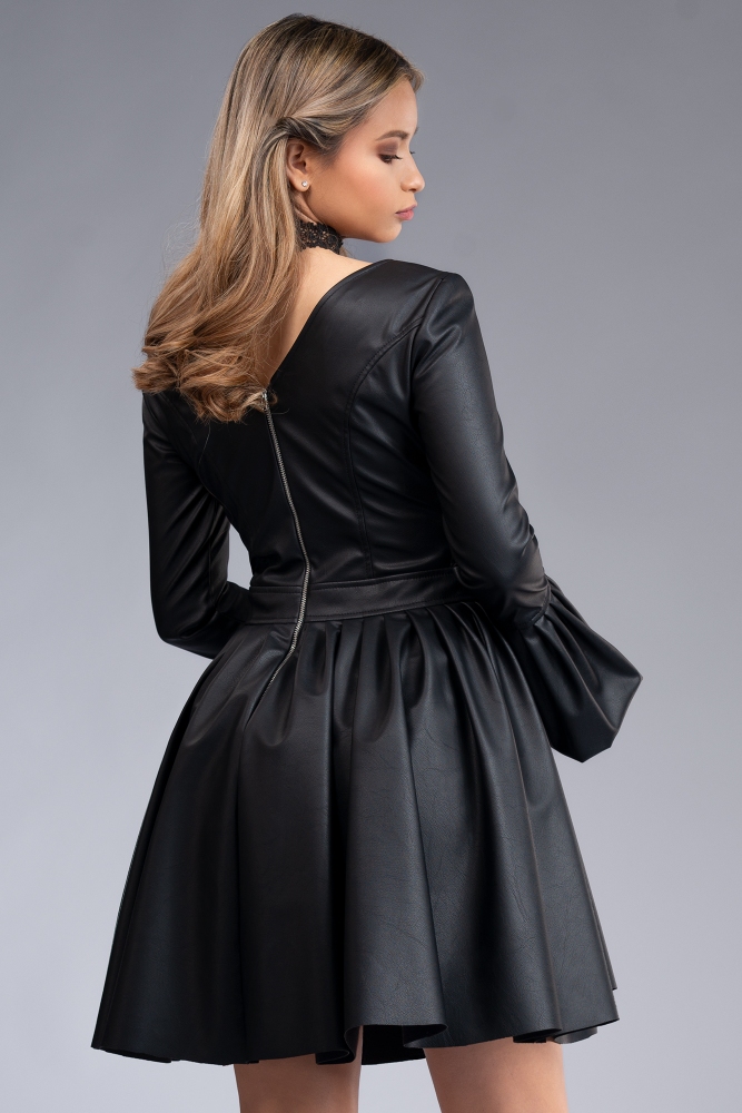 Rochie elegantă, realizată din piele ecologică de calitate, cu un design modern, ideală pentru evenimente, ținute statement sau apariții de seară.