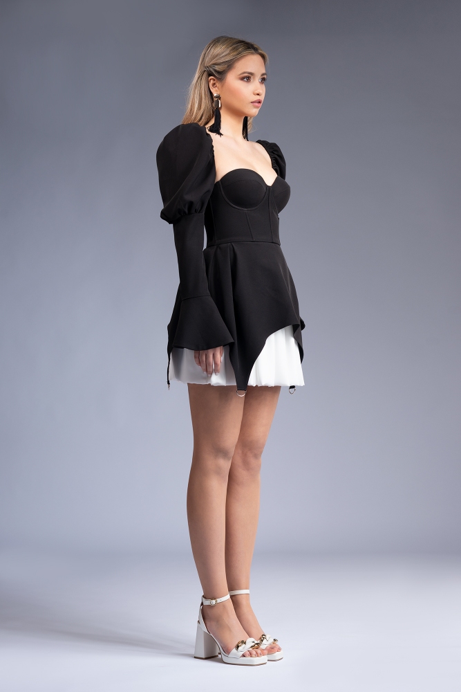Construcția rochiei combină eleganța bustului tip corset cu elemente actuale, precum fusta cu detalii metalice și închiderea la spate cu fermoar și șnur, ceea ce îi conferă un stil fresh, potrivit colecțiilor de sezon. Materialele folosite, stofa ușor elastică și voalul, asigură structură, confort și o purtare impecabilă.